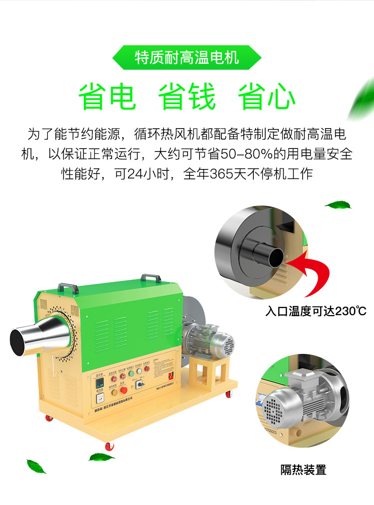 ④為了節(jié)約能源,循環(huán)型系列熱風(fēng)機(jī)都配備特制定做耐高溫電機(jī),以保證正常運(yùn)行,大約可節(jié)省50-80%的用電量。