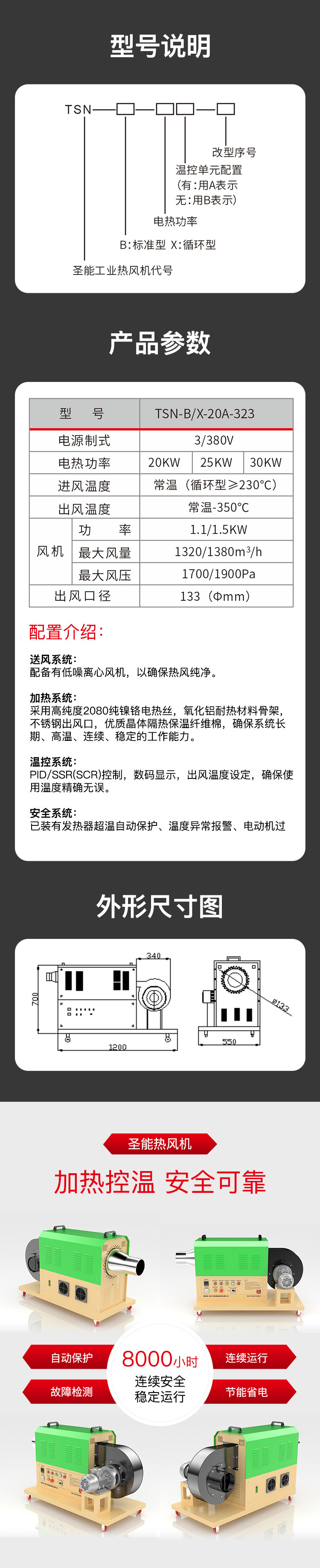 “TSN”工業(yè)熱風(fēng)機(jī)主要由送風(fēng)系統(tǒng)、加熱系統(tǒng)、溫控系統(tǒng)三大部分部分組成。通電后,鼓風(fēng)機(jī)把空氣吹送到加熱器里,令空氣從螺旋狀的電熱絲內(nèi)、外側(cè)均勻通過,電熱絲通電后產(chǎn)生的熱量與通過的冷空氣進(jìn)行熱交換,從而使出風(fēng)口的風(fēng)溫升高。出風(fēng)口處的K型熱電偶及時(shí)將探測到的出風(fēng)溫度反饋到溫控儀,儀表根據(jù)設(shè)定的溫度檢測著工作的實(shí)際溫度,并將有關(guān)信息傳遞回固態(tài)繼電器進(jìn)而控制加熱器是否工作。同時(shí),鼓風(fēng)機(jī)可利用風(fēng)量調(diào)節(jié)器(變頻器、手動(dòng))調(diào)節(jié)吹送空氣的風(fēng)量大小。另外,送風(fēng)系統(tǒng)及加熱器,均有過載超溫自動(dòng)保護(hù)裝置,總電路也設(shè)計(jì)了緊急摯,以保證安全,防止錯(cuò)誤操作。