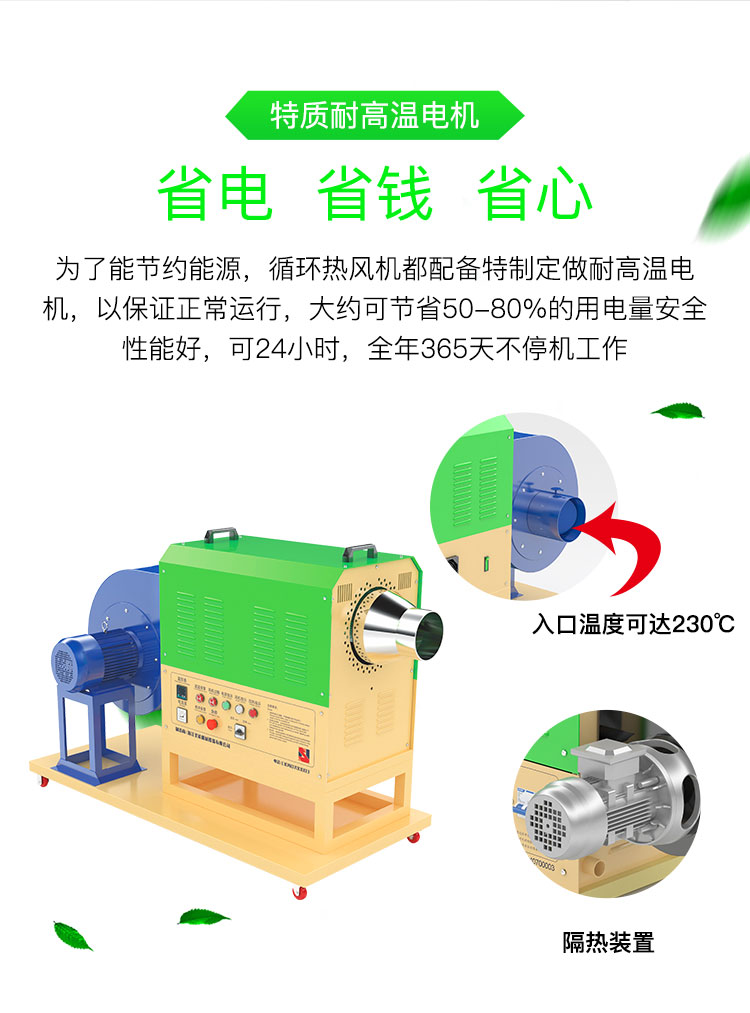 ④為了節(jié)約能源,循環(huán)型系列熱風(fēng)機(jī)都配備特制定做耐高溫電機(jī),以保證正常運(yùn)行,大約可節(jié)省50-80%的用電量。