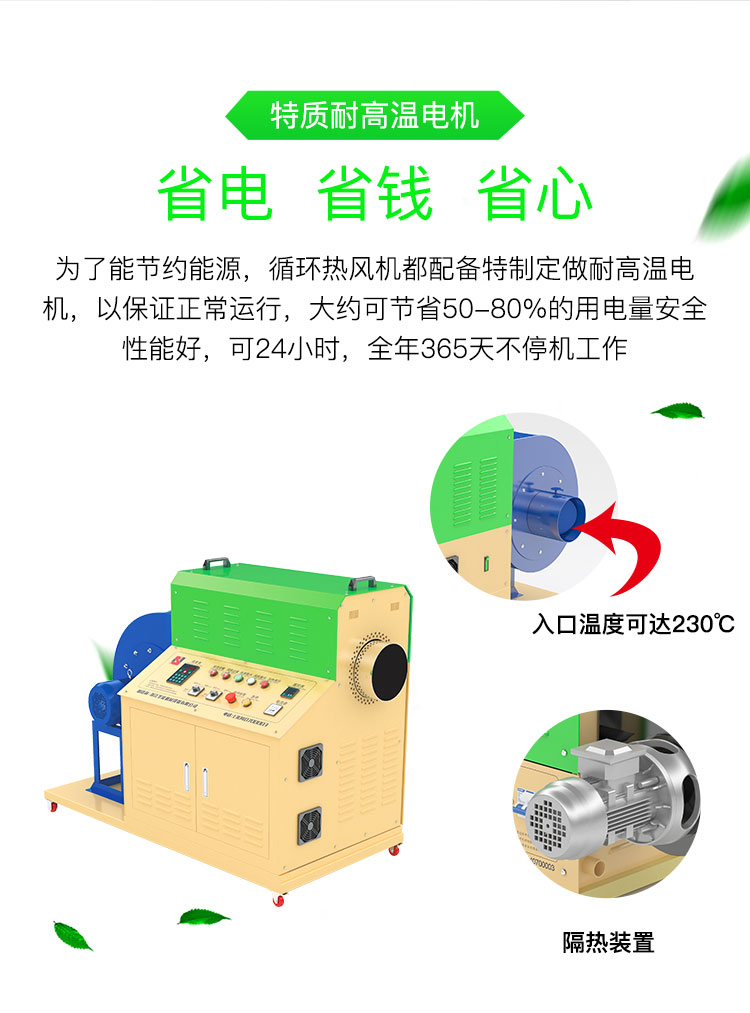 ④為了節(jié)約能源,循環(huán)型系列熱風(fēng)機(jī)都配備特制定做耐高溫電機(jī),以保證正常運(yùn)行,大約可節(jié)省50-80%的用電量。