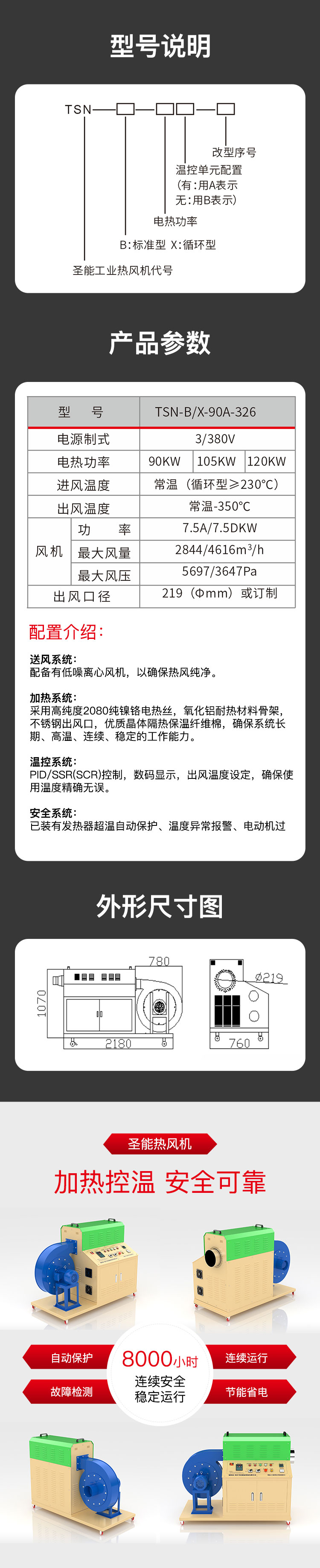 “TSN”工業(yè)熱風(fēng)機(jī)主要由送風(fēng)系統(tǒng)、加熱系統(tǒng)、溫控系統(tǒng)三大部分部分組成。通電后,鼓風(fēng)機(jī)把空氣吹送到加熱器里,令空氣從螺旋狀的電熱絲內(nèi)、外側(cè)均勻通過(guò),電熱絲通電后產(chǎn)生的熱量與通過(guò)的冷空氣進(jìn)行熱交換,從而使出風(fēng)口的風(fēng)溫升高。出風(fēng)口處的K型熱電偶及時(shí)將探測(cè)到的出風(fēng)溫度反饋到溫控儀,儀表根據(jù)設(shè)定的溫度檢測(cè)著工作的實(shí)際溫度,并將有關(guān)信息傳遞回固態(tài)繼電器進(jìn)而控制加熱器是否工作。同時(shí),鼓風(fēng)機(jī)可利用風(fēng)量調(diào)節(jié)器(變頻器、手動(dòng))調(diào)節(jié)吹送空氣的風(fēng)量大小。另外,送風(fēng)系統(tǒng)及加熱器,均有過(guò)載超溫自動(dòng)保護(hù)裝置,總電路也設(shè)計(jì)了緊急摯,以保證安全,防止錯(cuò)誤操作。