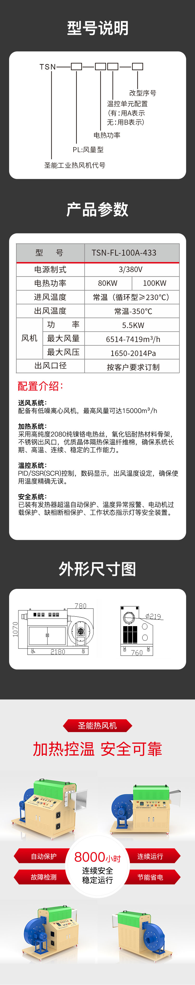 風量型熱風機主要由空氣加熱器和離心風機組成。空氣加熱器加熱產熱散熱,由離心風機將熱量輸出,從而調節空間溫度,風量型熱風機中加熱元件由2080鎳鉻絲加工成螺旋導管組成,從而發熱快、溫度效果好、工作風量大壓力較低。根據使用場所可分為:家用風量型熱風機和農業用風量型熱風機。從而家用和農業用風量型熱風機需根據客戶使用情況來進行風機和加熱功率的配比,望請客戶采購時將現場工況詳細說明。